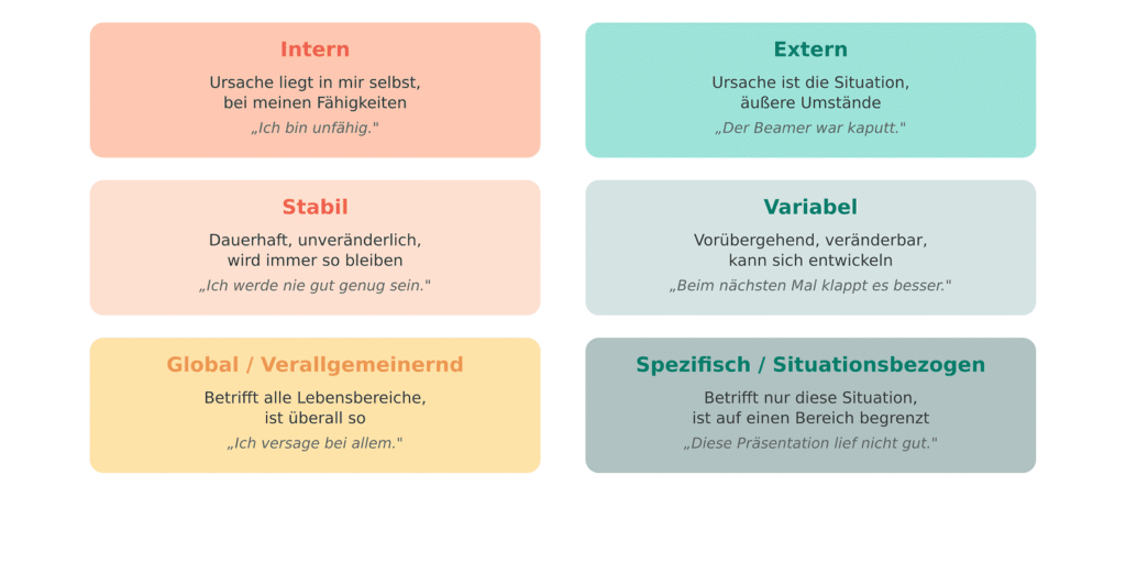 Bei Menschen mit chronischer innerer Leere zeigt sich häufig ein charakteristisches Muster: Sobald etwas schiefgeht, wird die Ursache intern („Ich bin nicht gut genug”), stabil („Das wird sich nie ändern”) und global („Ich versage bei allem”) interpretiert. Bei Erfolgen dagegen werden externe („Ich hatte nur Glück"), variable („Das war einmalig”) und spezifische („Nur in dieser Situation”) Ursachen angenommen.