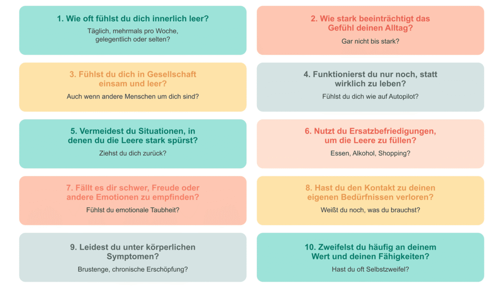 Es kann hilfreich sein, die eigene Situation einmal ehrlich zu betrachten. Die folgenden Fragen können dir dabei helfen zu beurteilen, wie stark die innere Leere dein Leben beeinflusst: