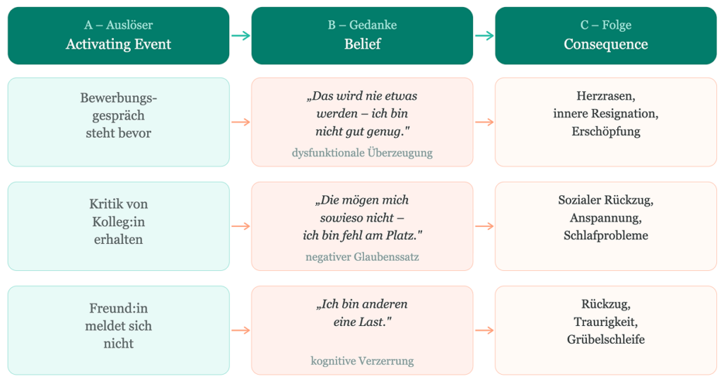 Um diesen Zusammenhang genauer zu verstehen, lohnt sich ein Blick auf das ABC-Modell der kognitiven Verhaltenstherapie. Es beschreibt, wie unsere (oft automatischen) Gedanken über eine Situation beeinflussen, wie wir diese erleben: