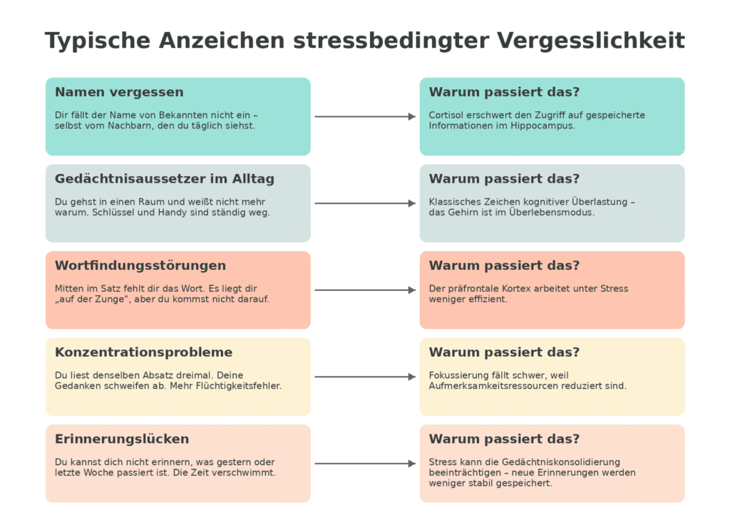 Wie äußert sich Vergesslichkeit durch Stress konkret im Alltag? Die Symptome sind vielfältig und betreffen vor allem das Kurzzeitgedächtnis und das episodische Gedächtnis (Erinnerungen an persönliche Erlebnisse).